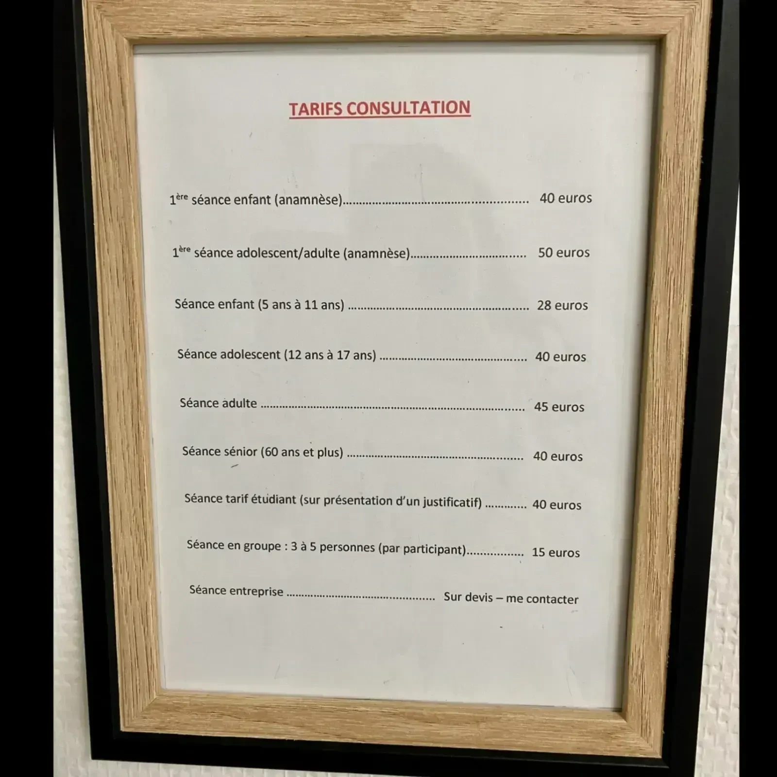Rubriques Le bureau La salle de relaxation Le coin enfant Tarifs des consultations Voir toutes les Pages Pages Le bureau La partie "Bureau"Lors de la première séance, l'anamnèse, c'est dans cette pièce que se déroulera l'entretien. Les temps de parole pré et post-exercices de relaxation peuvent avoir lieu dans le bureau ou dans la salle de relaxation, à votre convenance, je m'adapte. La salle de relaxation C'est dans cette pièce que se dérouleront les exercices.J'ai essayé de créer un lieu reposant, chaleureux, apaisant surtout. Le fauteuil peut s'allonger totalement si vous voulez être parfaitement allongé ou se mettre semi-assis ou assis complètement (tout dépendra de vous : vous choisissez la position dans laquelle vous êtes le plus conforta... Le coin enfant Nos petits loulous ont le droit de se relaxer eux aussi ! D'ailleurs, il a été prouvé que la relaxation possède beaucoup de bénéfices chez les enfants : elle améliore la concentration et la mémorisation, elle permet une meilleure gestion des émotions, elle soulage les angoisses ou phobies diverses (phobie scolaire, peur de noir...), elle peut... Tarifs des consultations Vous pouvez vous référer aux tarifs ci-dessus. La première séance est l'anamnèse : un grand questionnaire très complet pour faire votre connaissance et pouvoir déterminer au mieux les problèmes à résoudre et vous proposer un protocole personnalisé. Il y a des questions de base : votre identité, votre situation familiale... mais aussi des ques...